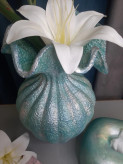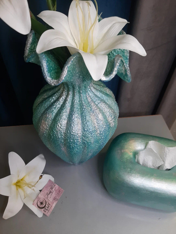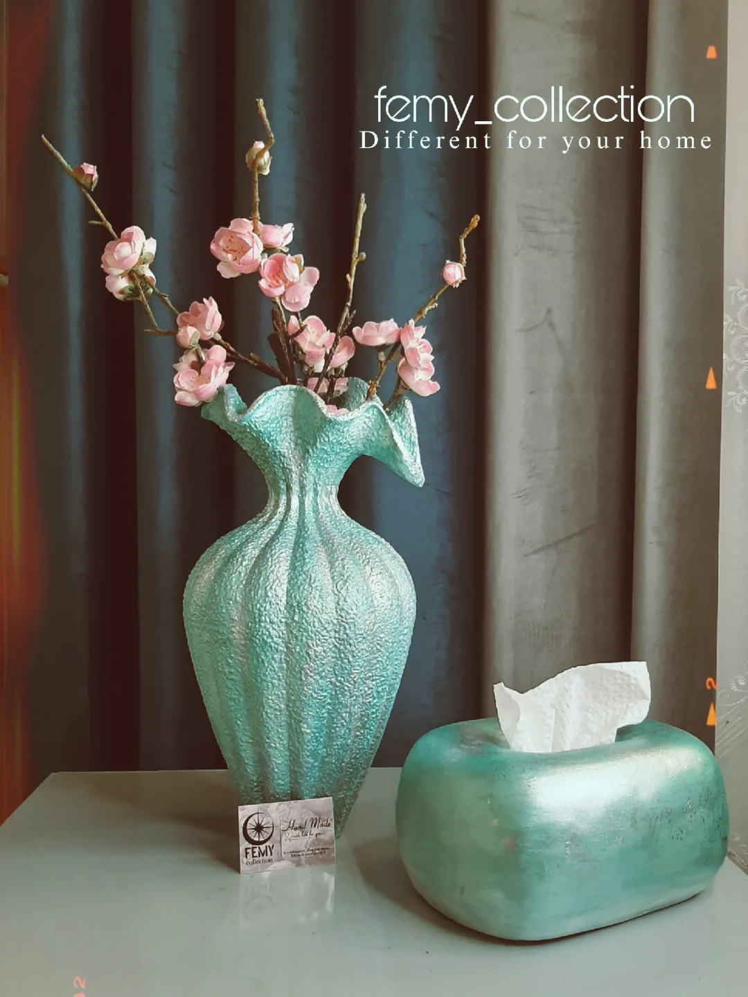 ترکیب گلدون و جا دستمال پلی استری "فمی" لمس خاصی از زیبایی و اصالت به دکور میده. گلدان پرنسسی با ارتفاع حدودی ۳۴ سانتیمتر و پتینه کاری شده.